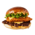 100% dubbele kipfilet, gefrituurd. Met onze heerlijke brioche bun, zoete burgersaus, sla, rode ui en cheddar kaas
