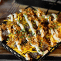 Friet met huisgemaakte saus, rundergehakt, cheddarsaus, gebakken ui, rode ui, mais en jalapeño's